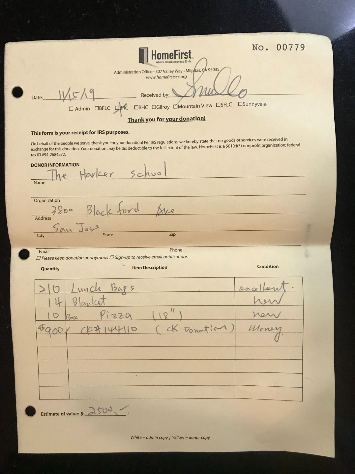 Community Service BEFORE Covid Pandemic-Help my parent (GLC) to host and organize "Packed 200 lunch bags and fundraising for HomeFirst Homeless Shelter" in 2017 and 2019 at The Harker School MultiPurpose Room.